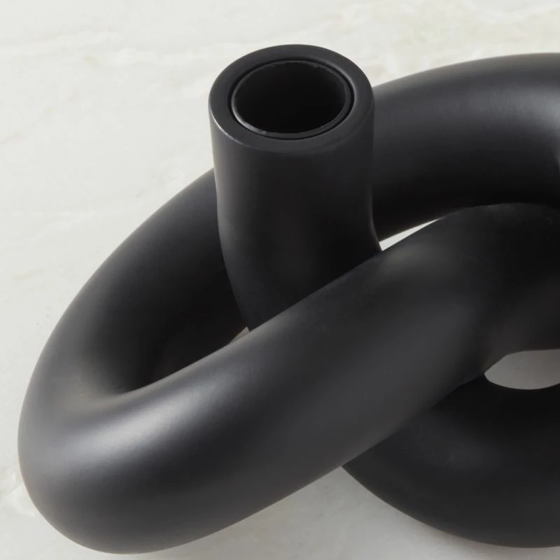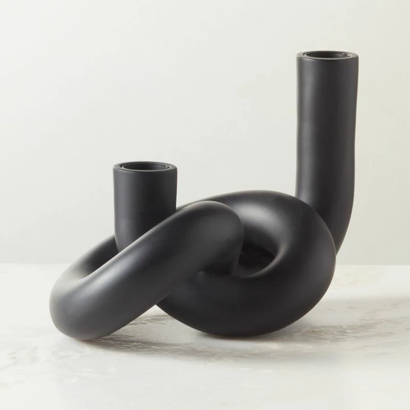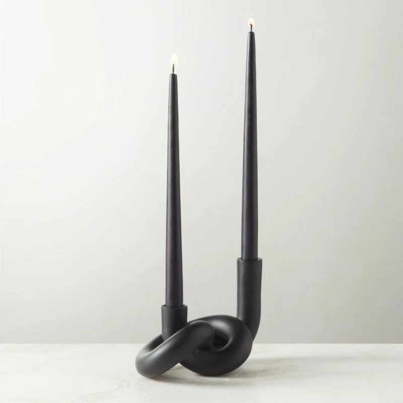 - The Asha Black Knotted Double Taper Candle Holder features a sleek, black design with a unique knotted detail, making it a stylish addition to any home.