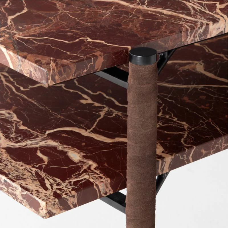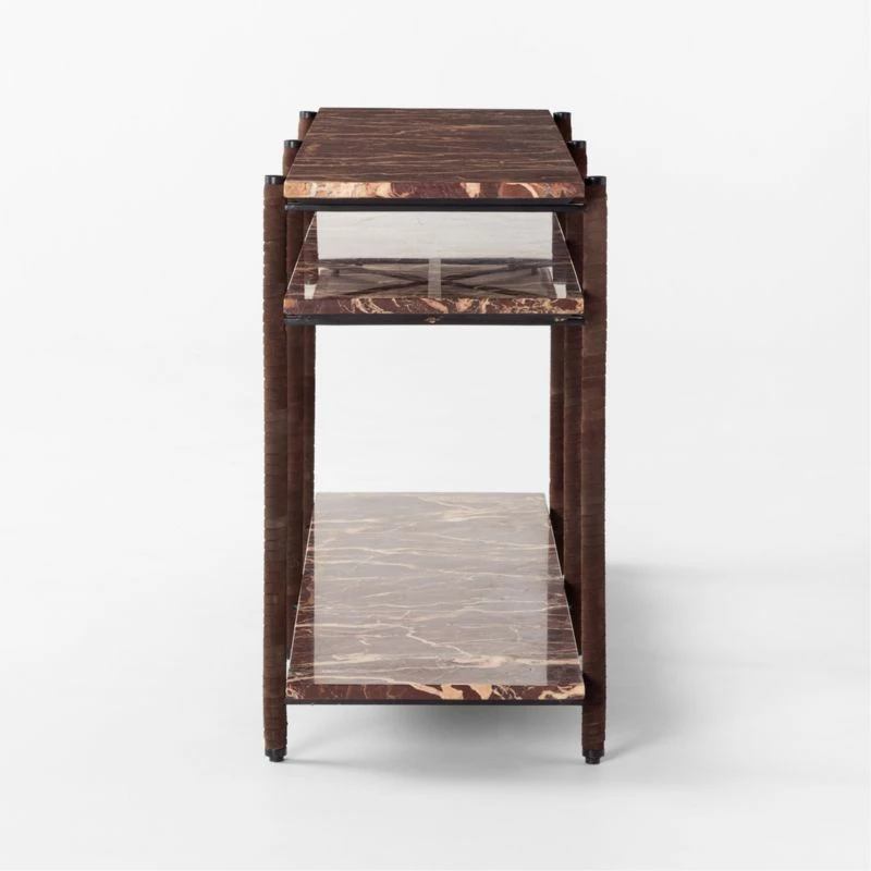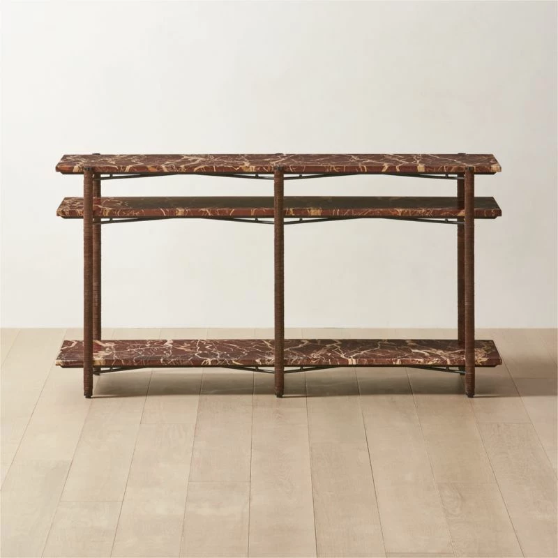 - The Ember Red Marble Console Table features a stunning red marble top paired with a sleek metal frame, offering a perfect blend of durability and sophistication.