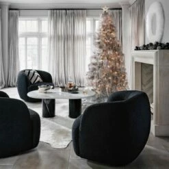- Experience unparalleled comfort with the Gwyneth Black Boucle Swivel Chair, designed to add a touch of elegance to your living room.