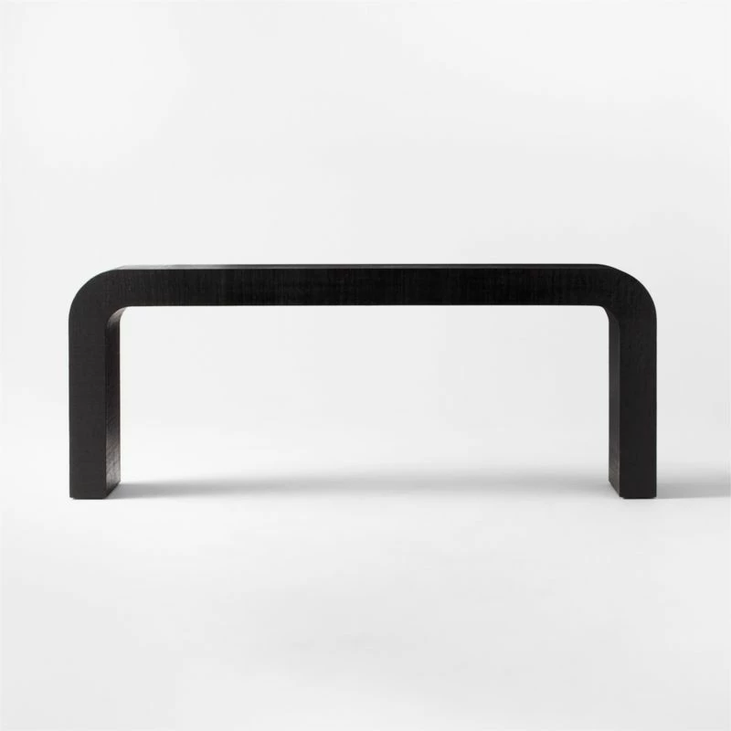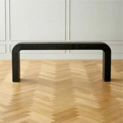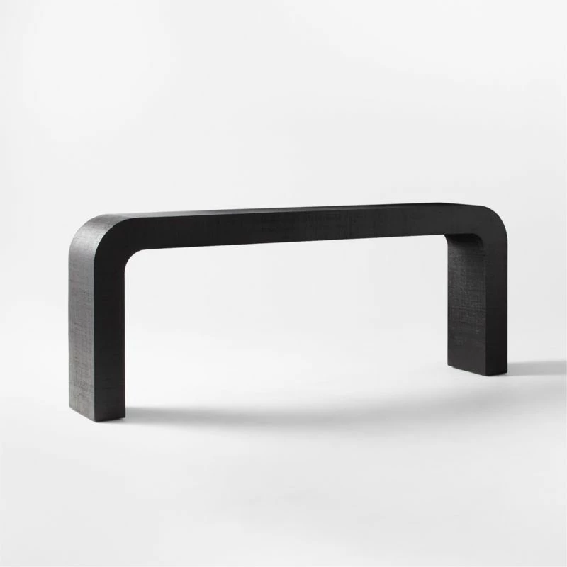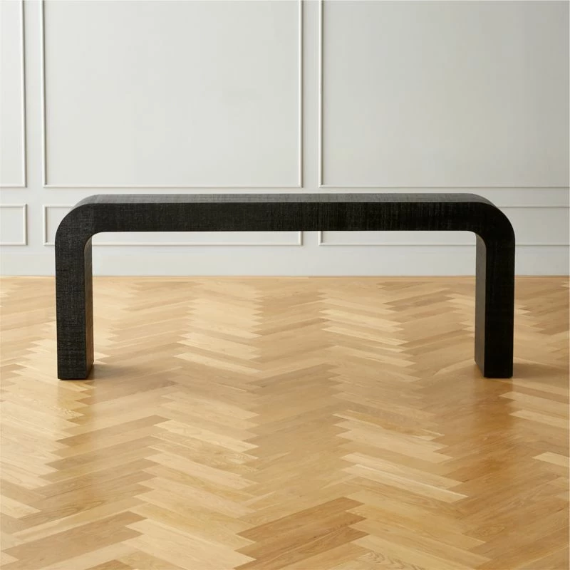 - Enhance your living room decor with the sleek and modern Horseshoe Black Lacquered Linen Console Table. Its 80-inch length provides ample surface space for your essentials.
