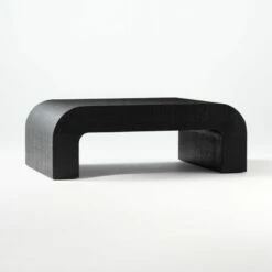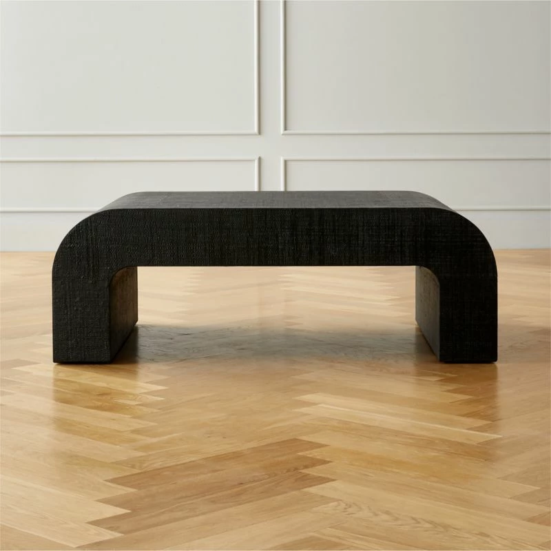 - Elevate your living room decor with the Horseshoe Black Laquered Linen Coffee Table. Its sleek black finish and 46″ size make it a perfect centerpiece for any modern home.