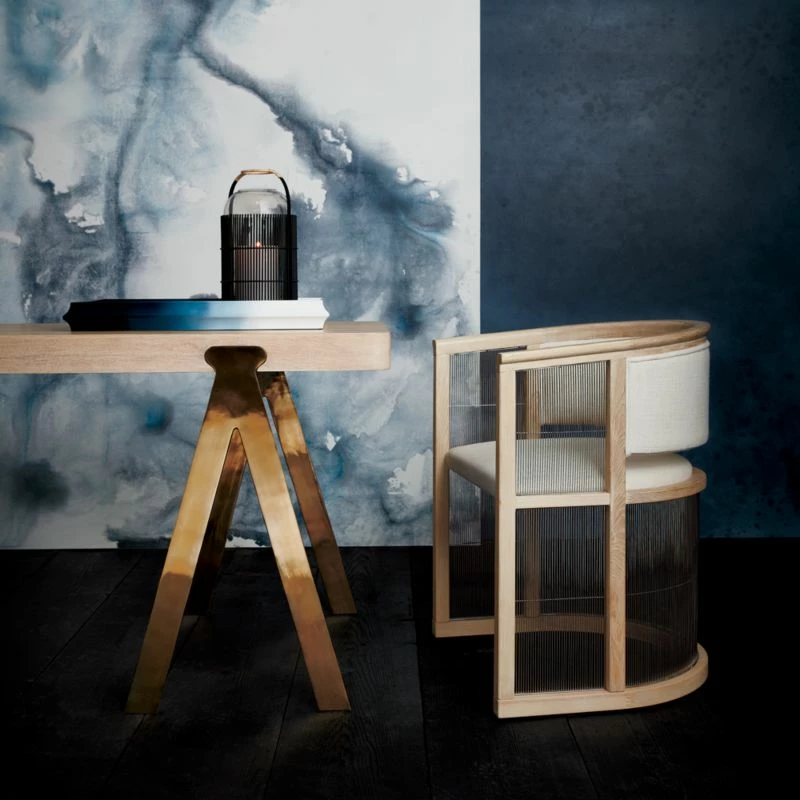 - Frame: Solid ash with white wash stain and steel mesh with antiqued finish