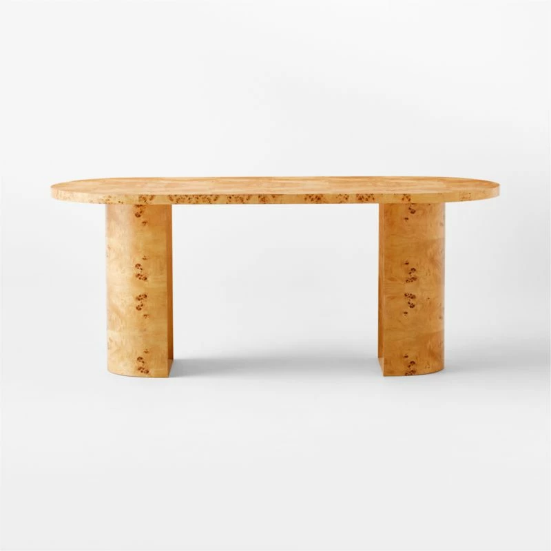 Designed by Studio Anansi, burl wood desk is minimalist in form while spotlighting rich burl wood. Rounded silhouette and chunky half-moon legs are wrapped in burl wood, highlighting the swirling grain and tonal variations in the wood. Large-scale desk is ideal for grand office spaces. CB2 exclusive.