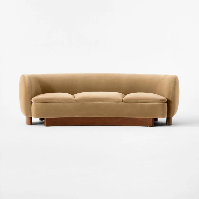 - The Muir Camel Velvet Curved Sofa is designed to bring elegance and comfort to your living room. Its unique curved design and plush velvet upholstery make it a standout piece in any home.