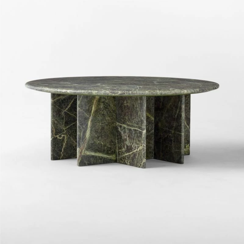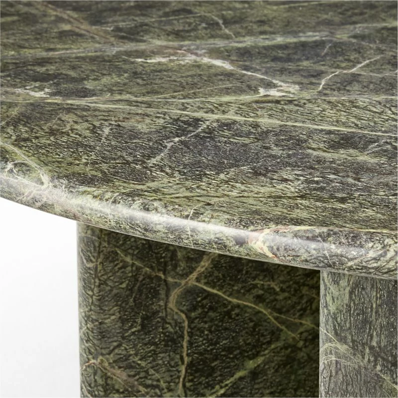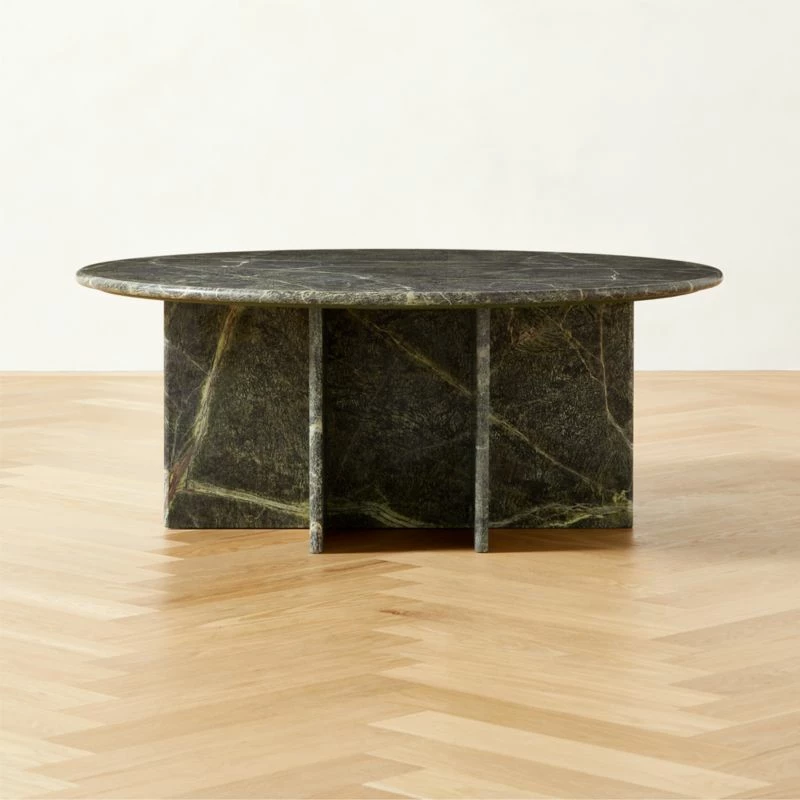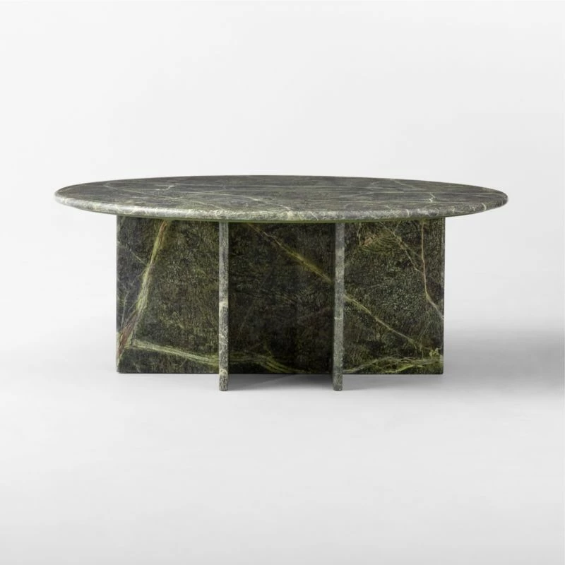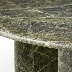 - The Pasar Round Green Marble Coffee Table features a stunning green marble top, offering a luxurious and sophisticated look for your living room.