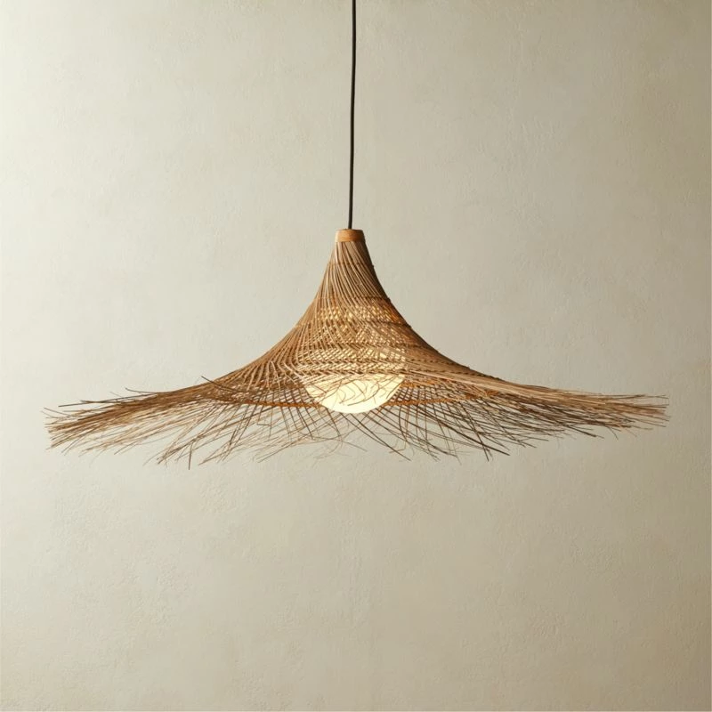 Coconut ribs sourced in the Philippines fan out in a handwoven chandelier. Larger in scale with a central glass globe that casts soft, warm light—an elevated way to introduce natural materials above the dining table. CB2 exclusive.