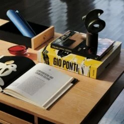 Believed to be among Gianfranco Frattini’s earliest designs, this well-proportioned desk was recreated from vintage black and white photographs. In staying true to its 1950s origins, our update retains the unique cutouts and spaces, with details such as a rubber-wrapped foot rest and solid wood drawer guides pulled directly from Frattini’s found photograph. Satin black powdercoated legs and a champagne brass crossbar beautifully complement the natural beauty of the wood, which is certified sustainable by the Forest Stewardship Council ®. The desktop and shelves are made with richly grained white cerused oak, with a black ebonized oak drawer that pulls out for dramatic contrast. Originally designed for an architect to accommodate rolls of drafting paper, the desk is well-suited for all modern professional pursuits. CB2 exclusive.