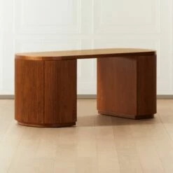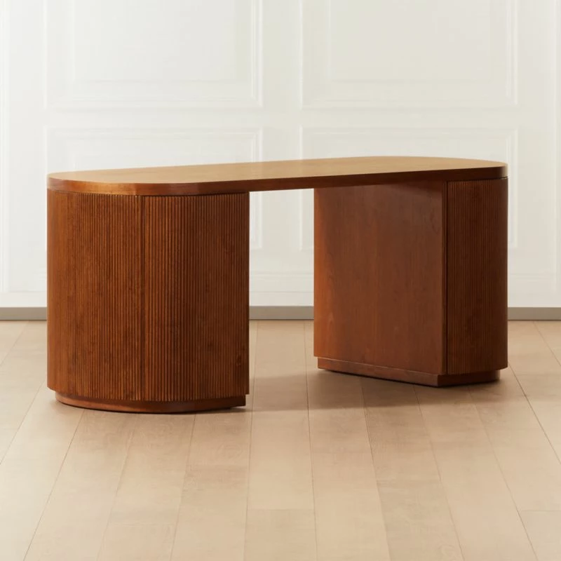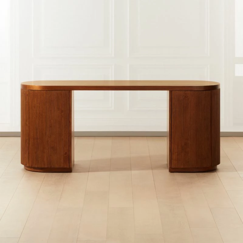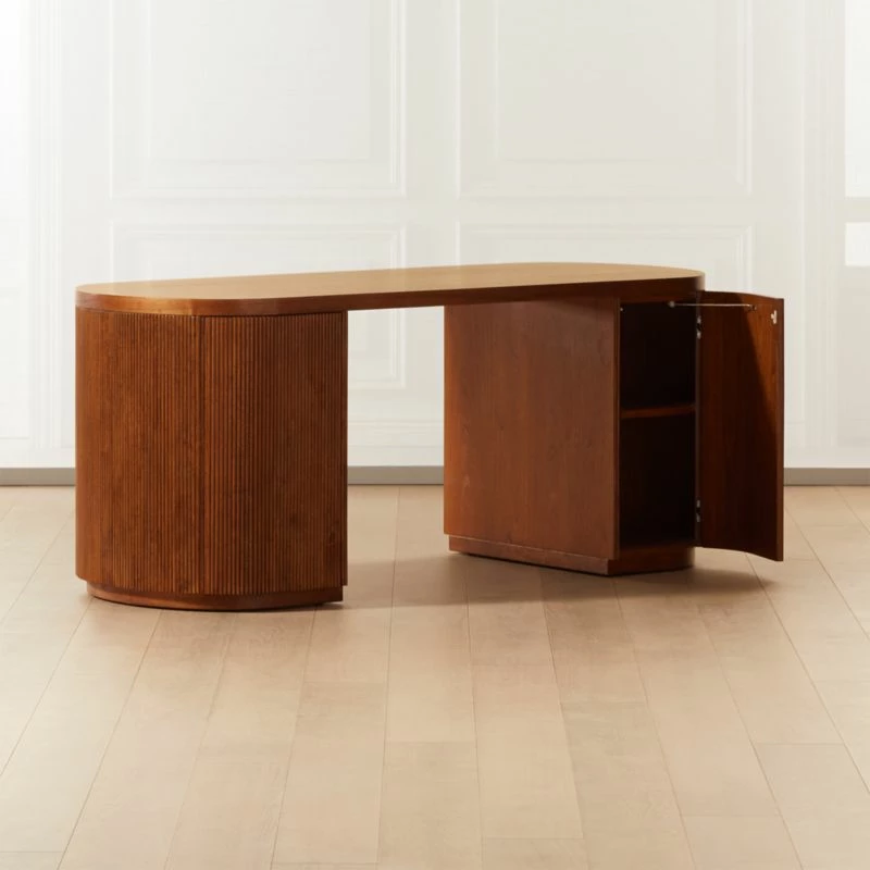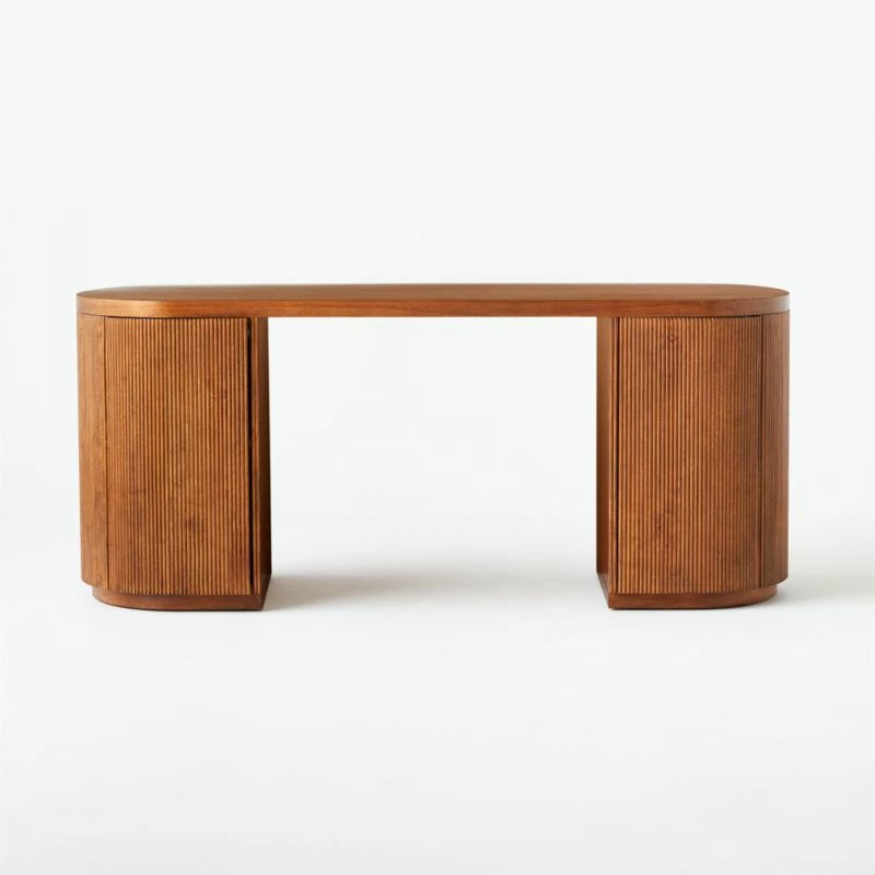 CEO of sophistication, brought to us by Mermelada Estudio. Modern, oversized executive desk in midtone brown rounds out on either side for maximum storage, one shelf per side. Push-to-open doors curve with the frame and are hidden beautifully with fluted repetition. Learn about Mermelada Estudio on our blog. CB2 exclusive.