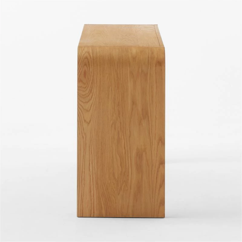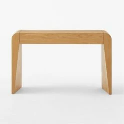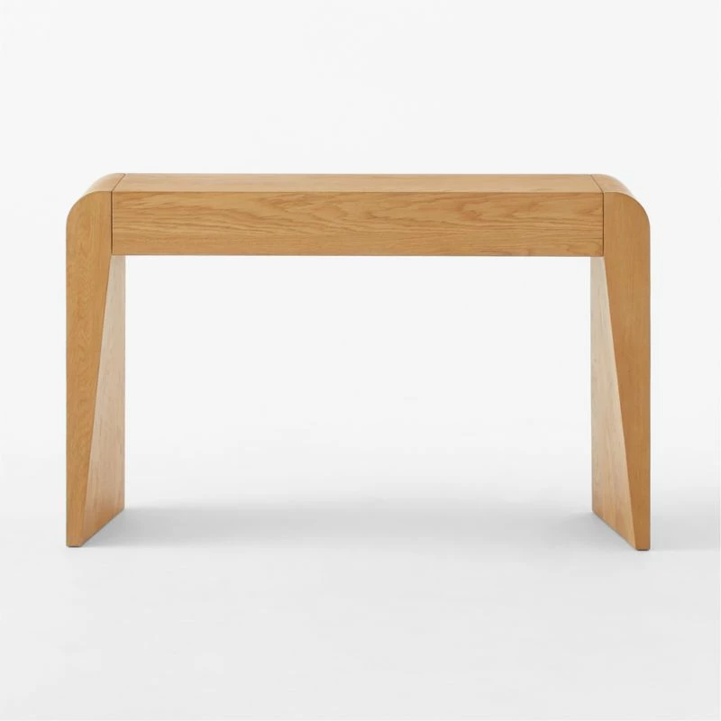 Vanity table by Brett Beldock seamlessly connects curves and angles. Crafted from oak certified sustainable by the Forest Stewardship Council ® (FSC), table displays beautiful wood grain throughout. Long push-to-open drawer offers space for grooming essentials. Designed as a vanity, it could also be a showstopper in the entryway. CB2 exclusive.