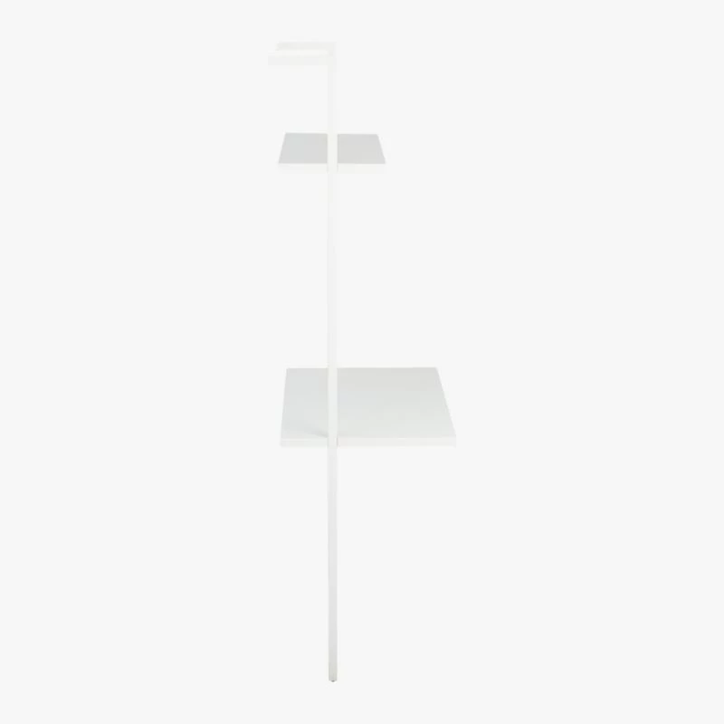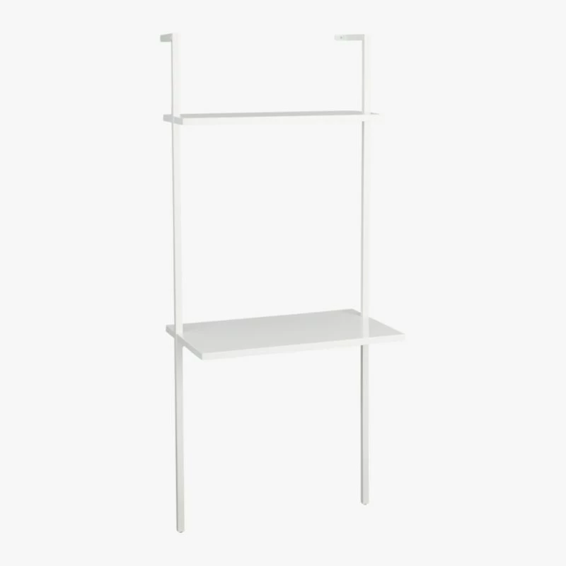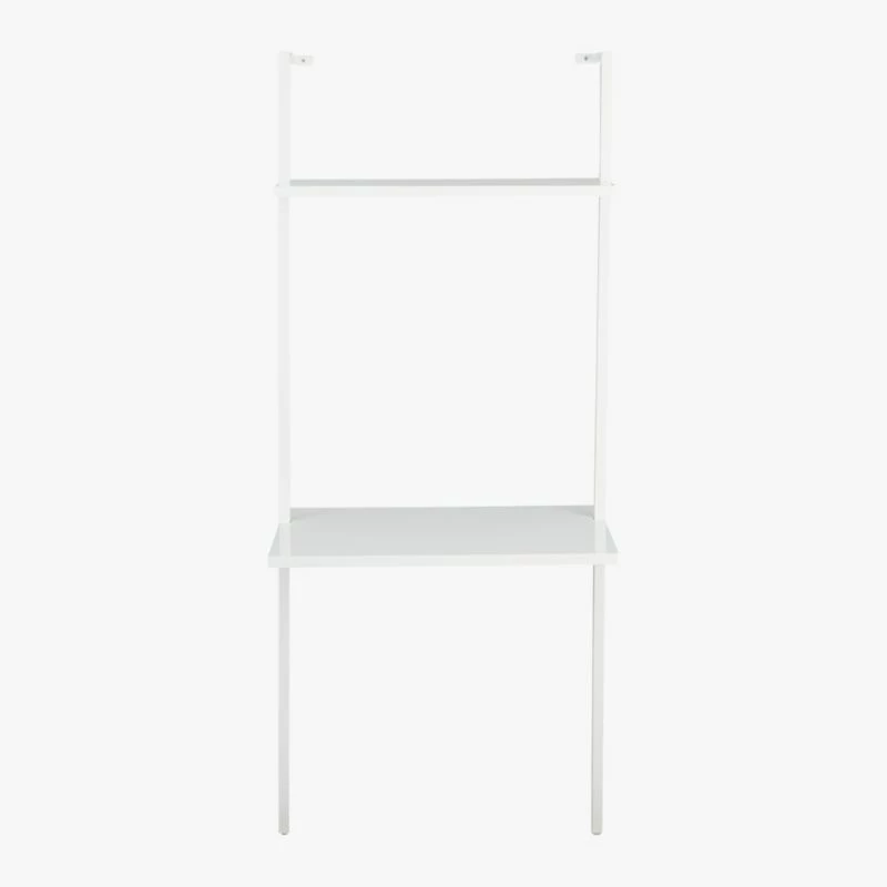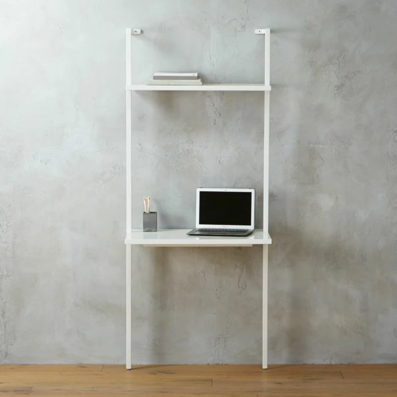 Minimalism scales for small spaces in clean, pristine white. A shorter version of our tall stairway white desk, sleek desktop surface and one shelf ladder up in engineered wood with glossy lacquer. Slick powdercoated aluminum frame with hidden hardware accentuates spotless rise of white. Mounts sturdy to the wall. Create a vertical library with stairway white wall-mounted bookcase. Coordinate with a modern office chair for a stylish and functional space.