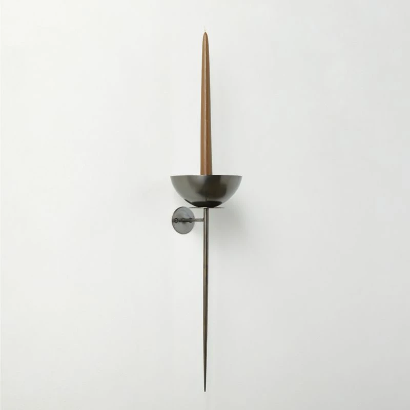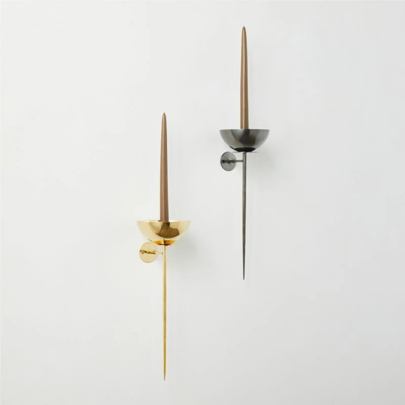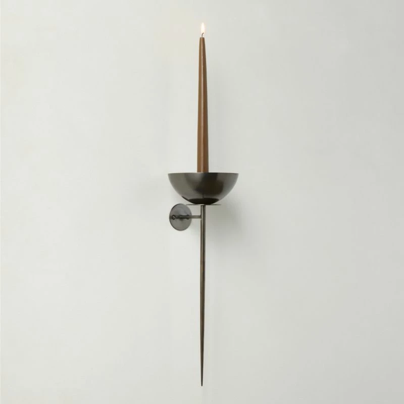 - The Vela Blackened Brass Wall Sconce Taper Candle Holder is a stunning addition to any home. Crafted from high-quality blackened brass, this wall sconce is designed to hold taper candles securely while adding a touch of sophistication to your decor.