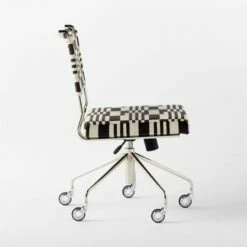 Armless, low-profile office chair by Mermelada Estudio has a French industrial feel. Polished stainless steel base and frame are complemented by artful casters with holes in the center for a stylish detail. Graphic patterned upholstery in black and white is bold, yet goes with everything. Also features adjustable seat and swivel.