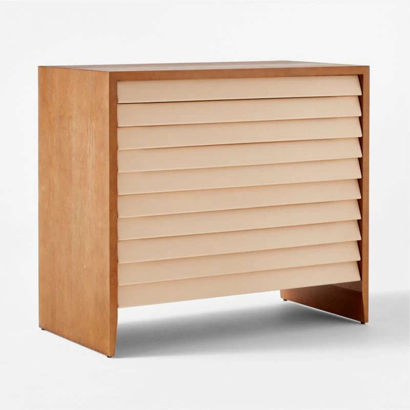 VUUE brings a distinctly 1970s Italian aesthetic to this handsome wood and vegan leather file cabinet. FSC ®-certified cerused ash veneer frame supports four file drawers, with tapered feet/legs that are mirrored in the cascading bevels of ivory faux leather drawer fronts. CB2 exclusive.